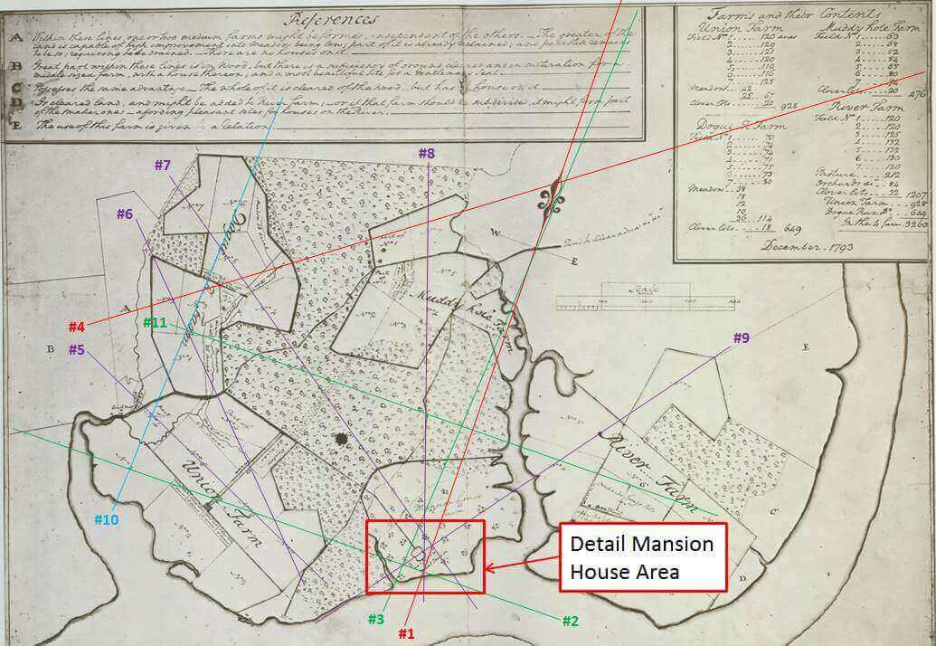 Lines 6 and 10 intersect between the “R” and “M” of “Dogue R Farm”. Drawing an East-West line through this point also passes between the “R’ and “M’ of “River Farm”, forming line #11, as shown in Figure 11. The line is confirmed by the intersections with “R” and “M”, or 13:18 twice.